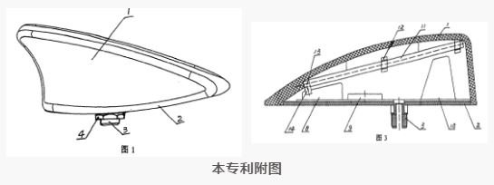 该专利的权利要求1内容为“一种鲨鱼鳍式天线,其特征在于具有天线外壳,天线外壳内侧上部设置有无线电接收天线,无线电接收天线一端设有天线信号输出端,天线信号输出端通过天线连接元件与天线放大器信号输入端相连接,或直接与同轴电缆匹配相连,天线外壳底部装有安装底板;所述无线电接收天线通过注塑嵌装或固定卡装在天线外壳内侧上部;在天线外壳内侧上部设置有无线电接收天线,所述无线电接收天线采用螺旋状弹簧天线、或金属天线,增加了天线接收无线电信号的有效长度,实现360度全向性信号接收;所述无线电接收天线为AM/FM共用天线。”