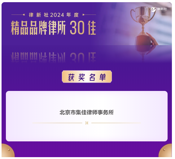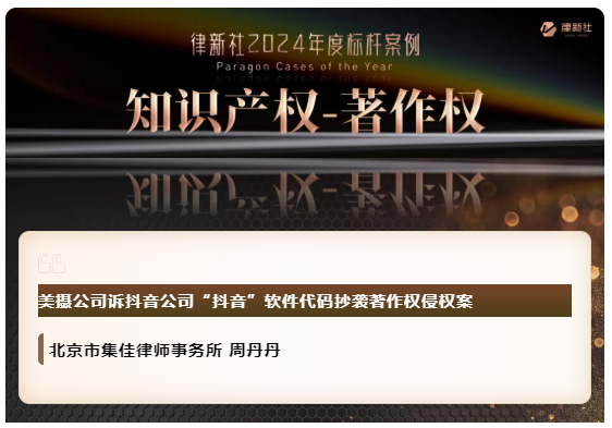新球体育凭借在知识产权保护领域卓越的专业实力与良好的行业口碑,入选《律所卓越品牌影响力指南(2024)》,荣获“律新社2024年度精品品牌律所30佳”奖项;同时,集佳周丹丹律师代理的“美摄公司诉抖音公司'抖音'软件代码抄袭著作权侵权案”获评“律新社2024年度标杆案例:知识产权-著作权领域”。
